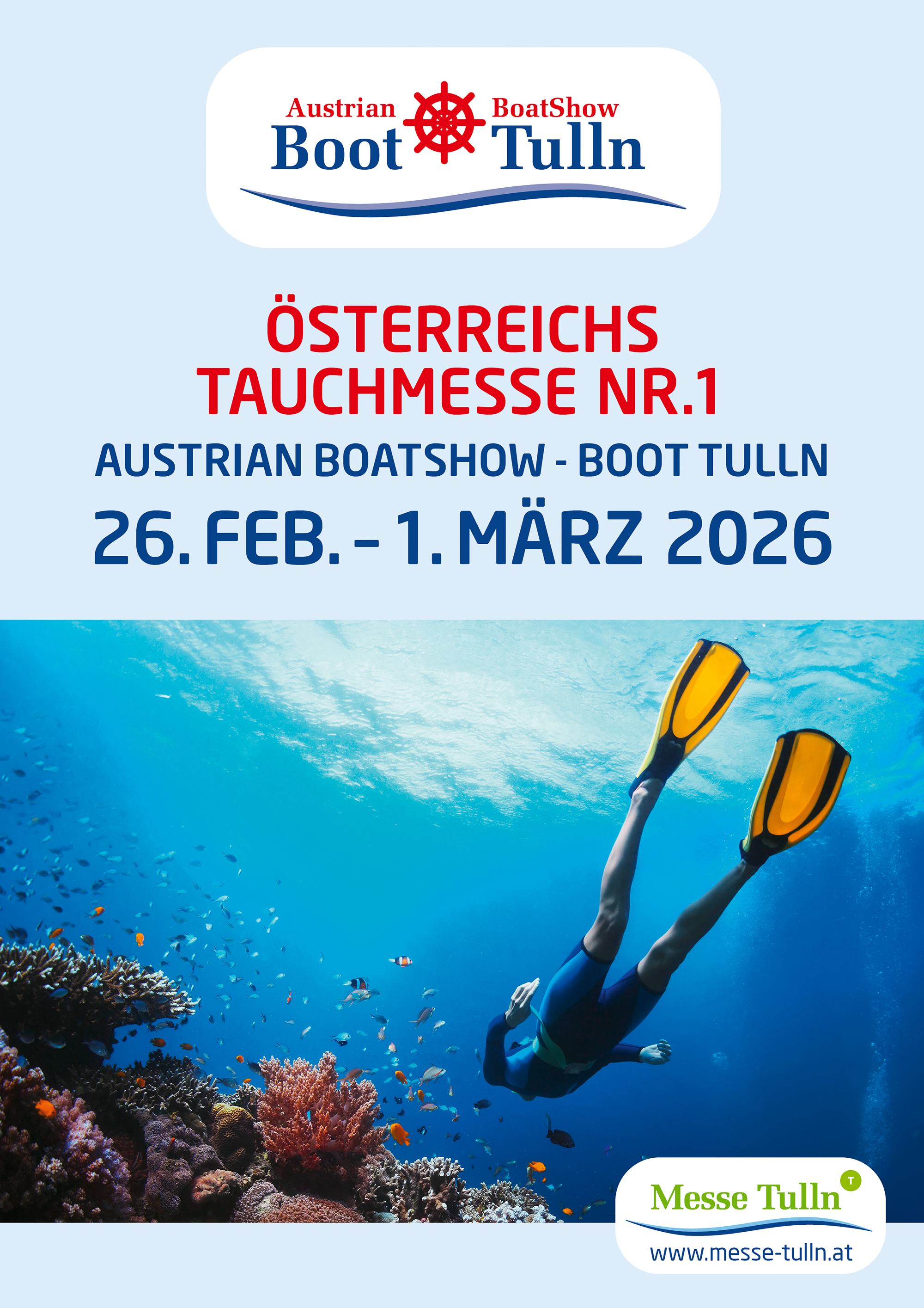 Die Austrian BoatShow - BOOT TULLN bietet mit dem bereits etablierten Konzept "Österreichs Tauchmesse Nr. 1" in der Halle 8 eine einzigartige Plattform für die Tauchbranche. Hersteller, Tauchsporthändler, Tourismusregionen, Verbände und Vereine präsentieren die volle Markenvielfalt, Produktneuheiten und Trends, weltweite Tauch-Reisedestinationen, sowie alles rund um die Aus- und Weiterbildung im Tauchsport.