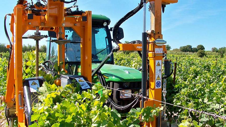 Der Laubhefter von Pellenc nimmt am Anfang einer Zeile automatisch ein bewegliches Drahtpaar auf, hebt es an und setzt zwischen den Pfählen Klammern, um die Vegetation nach oben hin zu halten. Außerdem werden während der Heftarbeit auch gleich die Triebe gewipfelt oder entspitzt, was einen Durchgang mit dem Laubschneider einspart.