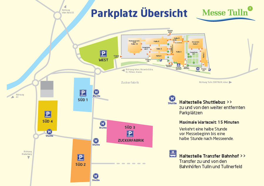 Von den weiter entfernten Parkplätzen SÜD ist ab 30 Minuten vor Messebeginn bis 30 Minuten nach Messeende ein kostenloser Shuttleservice zum Haupteingang der Messe eingerichtet. Die Wartezeit auf die Shuttle-Busse beträgt maximal 15 Minuten.